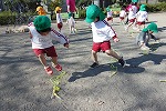 なわとびを地面においてピョン。なわとび練習の第一歩です。
