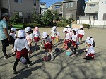 足と足の間にボールを入れて、足で触れてみます。意外と難しい・・・